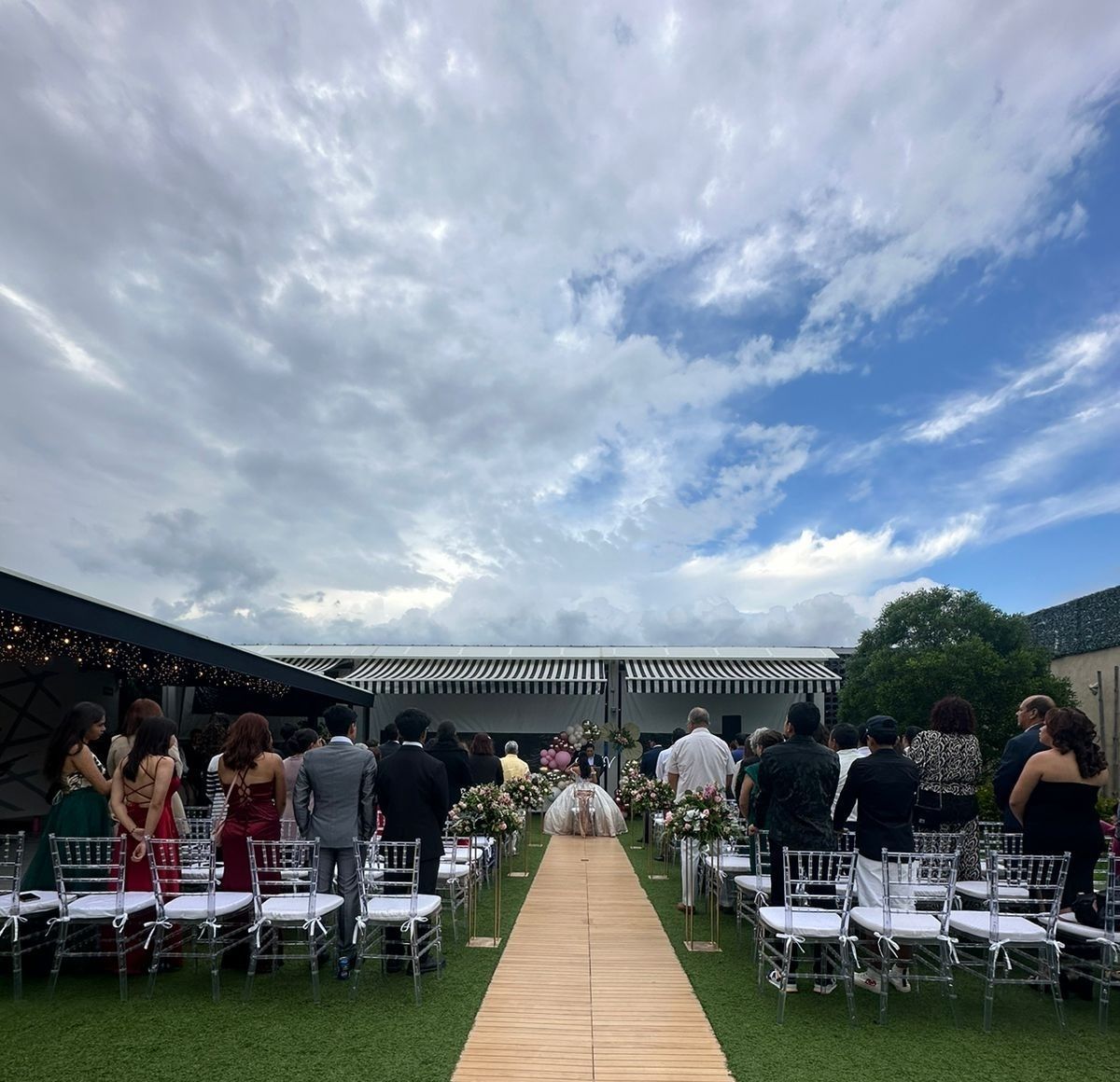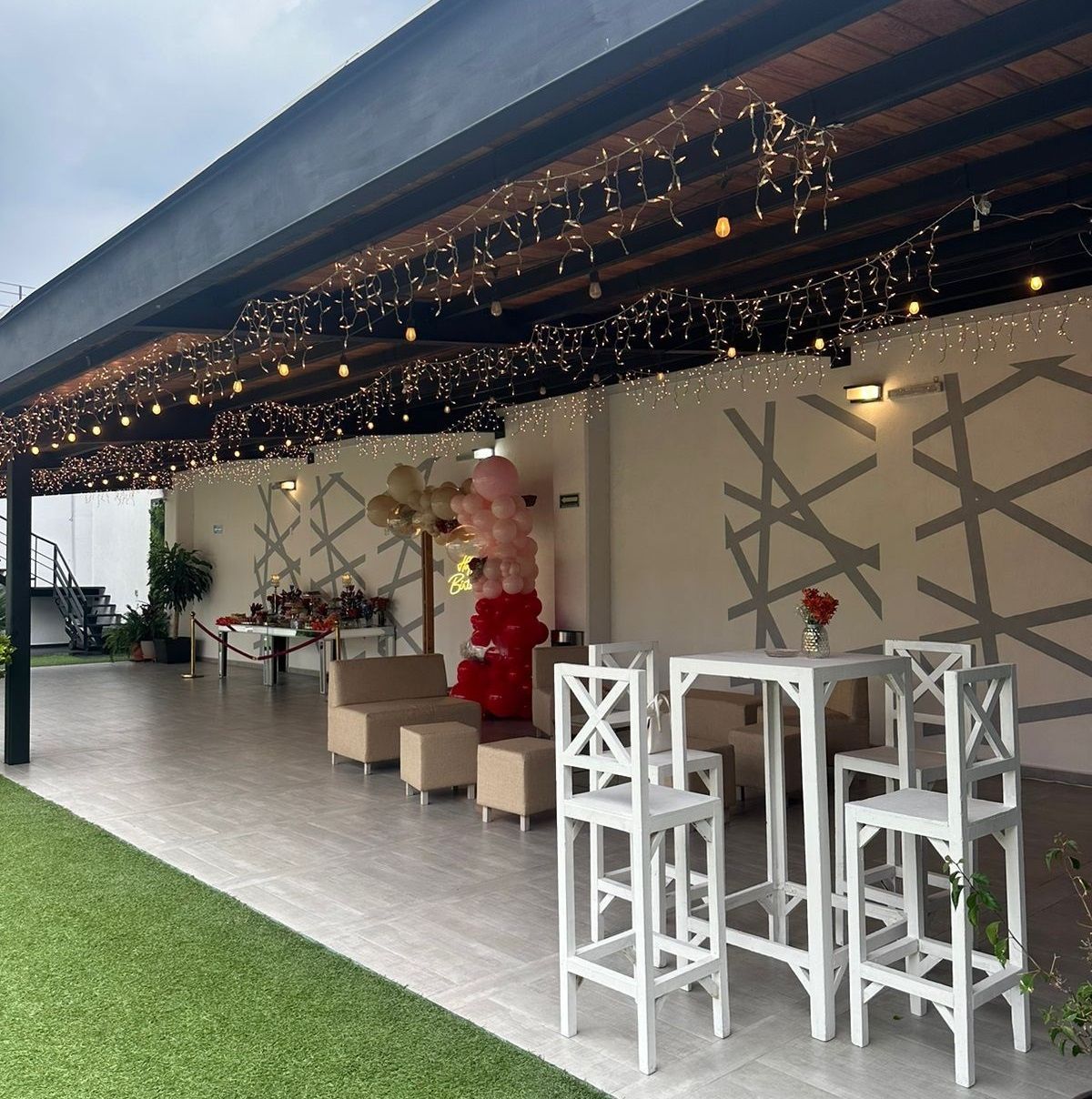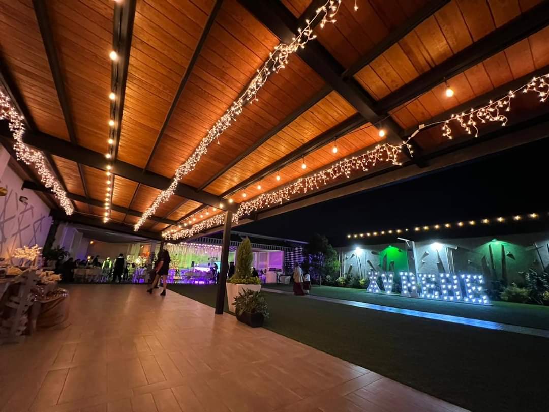 Nuestro salón de fiestas cuenta con la mejor decoración, donde incluimos un plafón de telas con jardín colgante, así como luces robóticas. Tenemos una terraza con iluminación vintage. Nuestro jardín está impecable, con cascadas de luces en los muros.